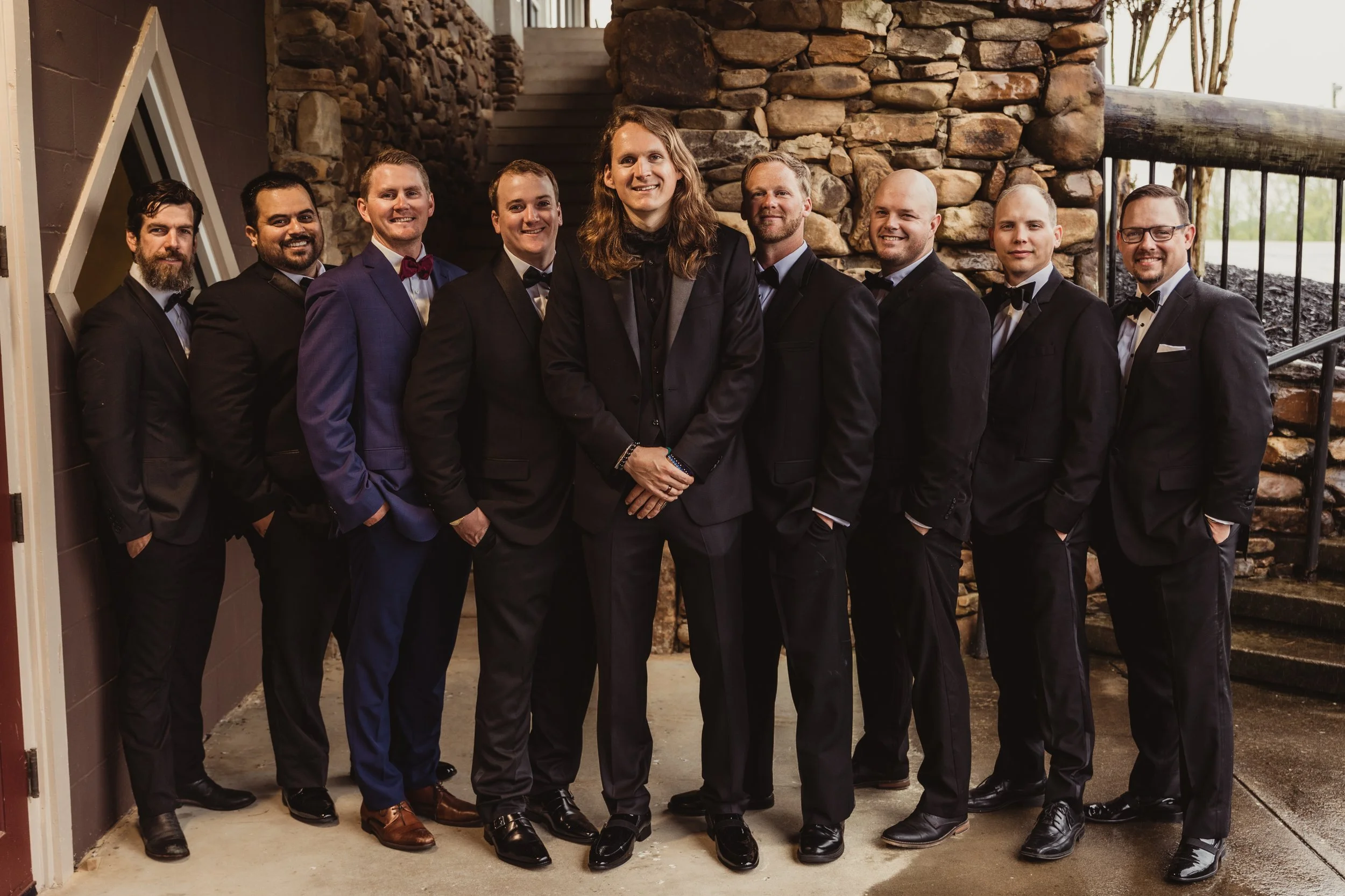 Kayla was absolutely breathtaking in her gown and her bridesmaids all looked so beautiful and unique in their varieties of all black dresses. Josh also cleaned up nicely in his all black suit. The black and white with rustic backdrop was truly amazing.
